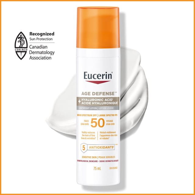 La lotion solaire pour le visage Eucerin Défense âge FPS 50 est formulée avec de l’acide hyaluronique pour réduire visiblement l'apparence des rides et des ridules.* Conçue pour un usage quotidien, elle protège le visage contre les rayons UVA/UVB et possède un complexe unique de 5 antioxydants (Bouclier 5 AntioxydantsMC) qui combattent les agresseurs environnementaux affaiblissant la barrière d’hydratation de la peau, pour une peau d’apparence plus saine.